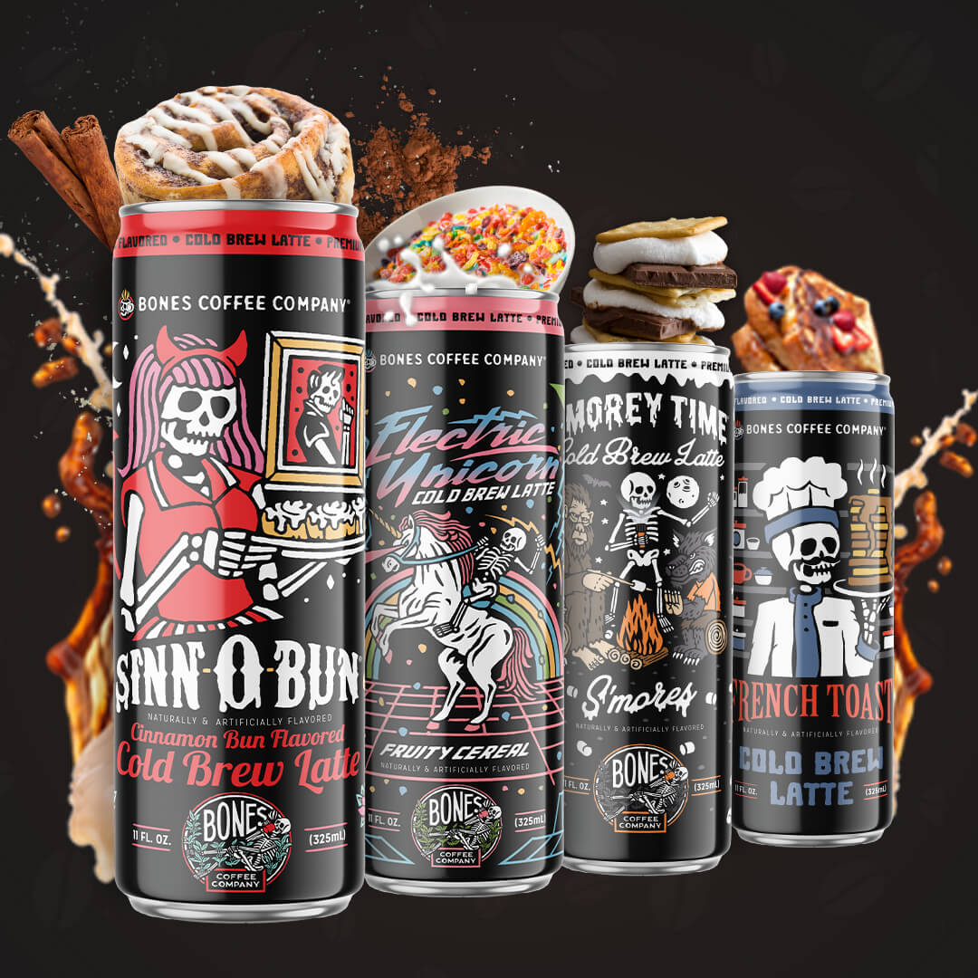 The temperatures are heating up, so why not cool down with Bones Coffee Cold Brew Lattes. We’ve taken some of your favorite Bones Coffee flavors and whipped them up into cold brew lattes that you can have on the go! You heard that right, grab and go cold brew lattes to make your next caffeine boost easy and convenient. Each flavor is packed with a powerful taste, so there is a flavor for everyone to enjoy!